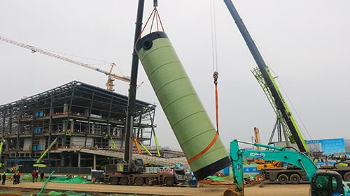 我司大型4.2*17米一体化预制泵站安装现场应用于市政工程环保建设!